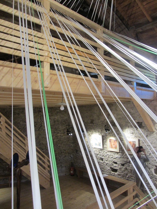 Des filins verts circulent dans l’espace d’une de mes sculptures à l’autre et leur nombre augmente à chaque fois.